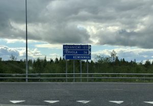 Meillä siirtymä kehä III:lta Napapiirille toteutettiin jo ennen ruuhkahuippuja. Startti sunnuntaina aamulla klo 9.40 ja perillä Rovaniemellä klo 19.45, eli 10 tuntia ja 5 minuuttia saa ihailla suomalaista maisemaa, lähinnä metsäistä sellaista.